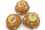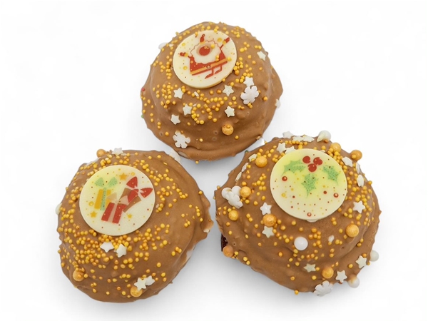 Een knapperig koekje met daarop een bavarois van aardbei of chocolade. Het gebakje is gedoopt in de chocolade en afgewerkt met leuke kerstdecoratie. Een tip vanuit onze bakkerij! Niet te groot dus makkelijk om tussendoor mee op te eten.