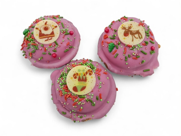Een knapperig koekje met daarop een bavarois van aardbei of chocolade. Het gebakje is gedoopt in de chocolade en afgewerkt met leuke kerstdecoratie. Een tip vanuit onze bakkerij! Niet te groot dus makkelijk om tussendoor mee op te eten.